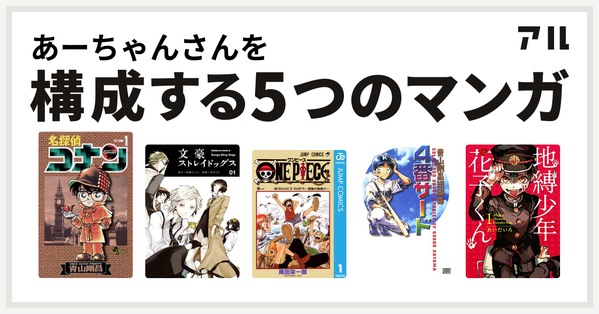あーちゃんさんを構成するマンガは名探偵コナン 文豪ストレイドッグス One Piece 青山剛昌短編集 4番サード 地縛少年 花子くん 私を構成する5つのマンガ アル